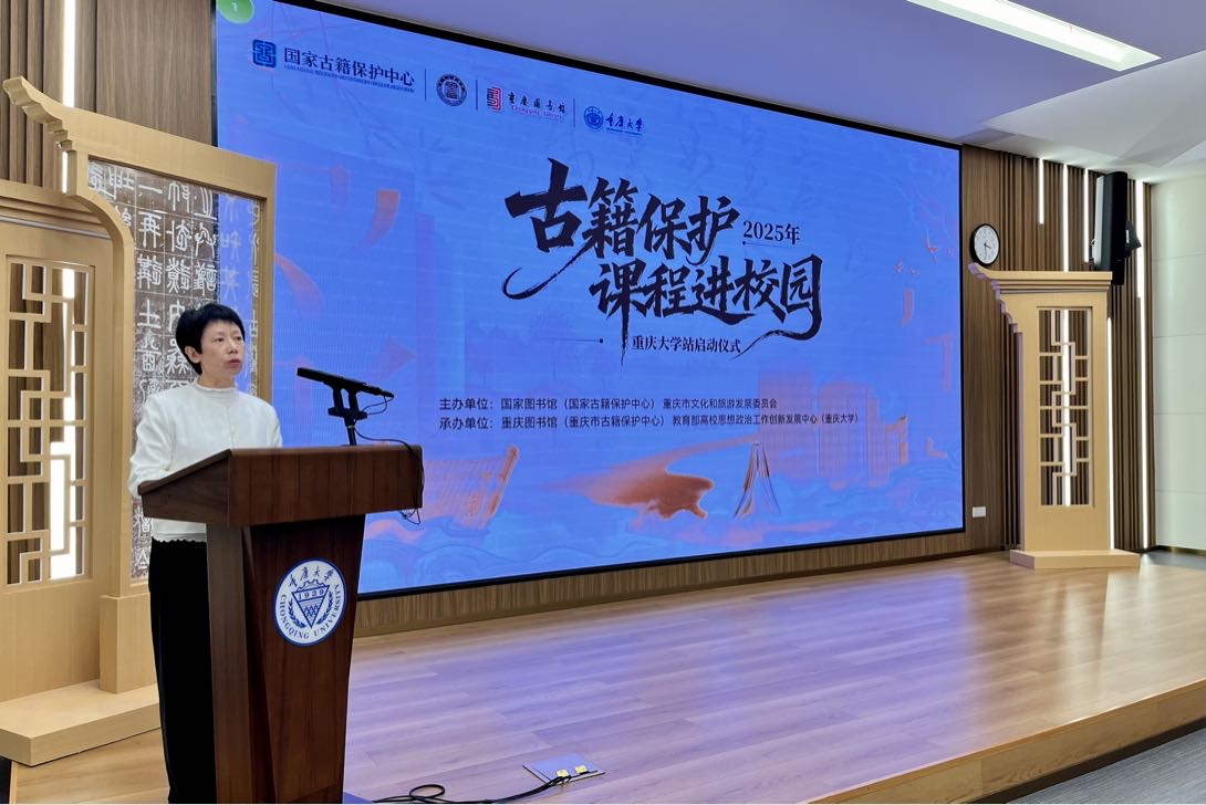 启动仪式后,重庆站首场“古籍保护课程进校园”活动随即在重庆大学经管楼报告厅举行。国家图书馆副馆长霍瑞娟为重庆大学的同学们带来了题为“予图书馆以智慧——带您走进中国国家图书馆”的专题讲座。她简要介绍了国家图书馆牵头建设的全国智慧图书馆体系,同时重点分享了古籍智慧化平台和“中国记忆”项目的相关情况。通过互动与交流,为青年学子了解人文领域发展动态、拓宽学术视野打开了一扇窗口。