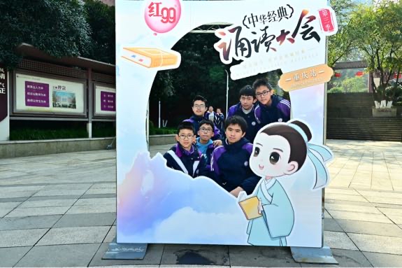 学生在中华经典诵读大会户外打卡点合影。王海 摄