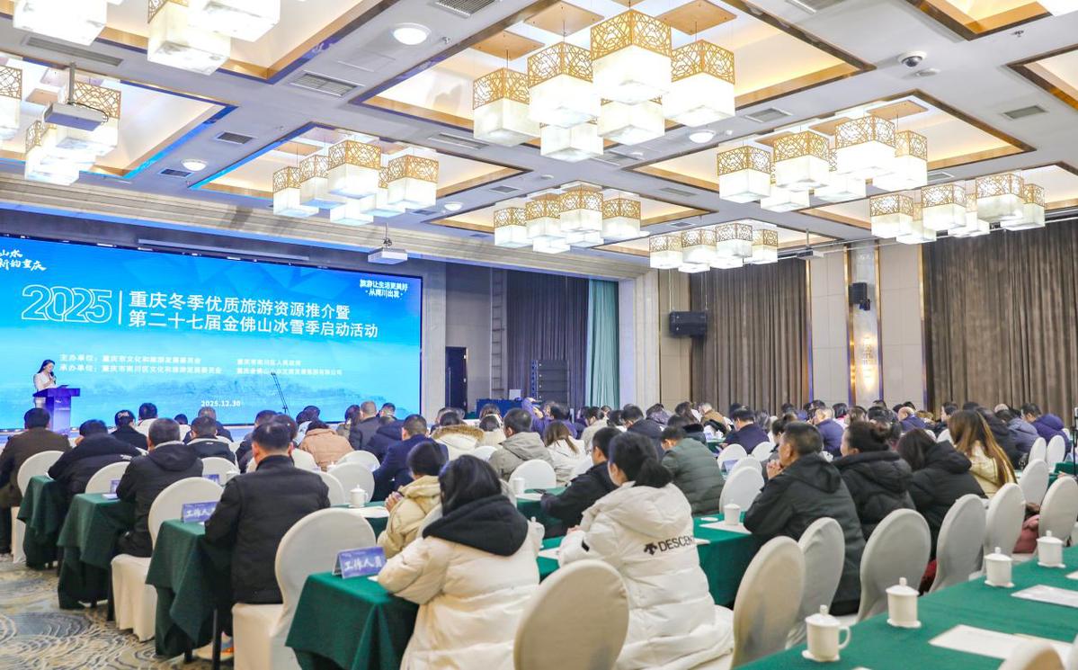 12月30日,由重庆市文化和旅游发展委员会、重庆市南川区人民政府联合主办的“旅游让生活更美好・从南川出发”2025 年重庆冬季优质旅游资源推介暨第二十七届金佛山冰雪季启动活动,在重庆市南川区金佛山西坡天星两江假日酒店与北坡滑雪场双会场联动举行。这场以冰雪为纽带的文旅盛宴,不仅拉开了重庆冬季旅游的璀璨帷幕,更同步亮相金佛山“冰雪祈鸿运·马上来接福”元旦主题活动与天星小镇“山海绮梦·璀璨鸿运”主题灯展;现场发布的冬季特色旅游线路,为市民游客奉上了集运动、文化、美食、祈福于一体的冬日文旅大餐。