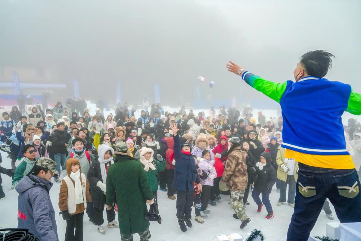 与此同时,金佛山北坡滑雪场分会场氛围热力拉满:DJ动感打碟点燃全场热情,MC与游客趣味互动派送惊喜好礼;滑雪教练团队手持“第27届金佛山冰雪季开幕”的巨幅主题旗帜从雪道顶端呼啸而下,五彩彩烟腾空绽放,专业教练的花式滑雪表演行云流水,引得现场欢呼声不断,正式宣布金佛山冰雪季快乐开启。作为距离重庆主城最近的高山室外滑雪场,金佛山北坡滑雪场早在11月25日便已开板迎客,即将启动的位于金佛山西坡的金佛山冰雪运动体验中心和戏雪项目,也将为游客提供更多元化的冰雪乐趣。