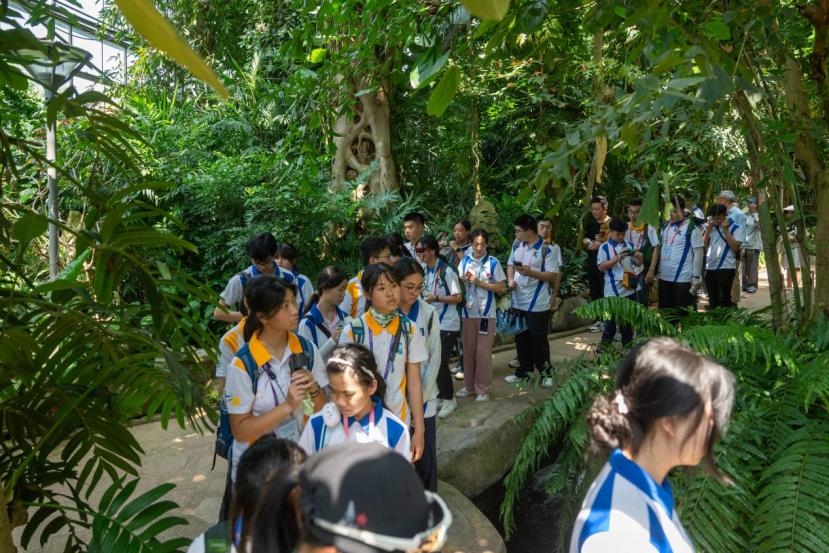“这里模拟了热带、亚热带的气候环境,汇聚了来自世界各地的奇花异草,是一个浓缩的‘植物星球’。”小王老师带着两地青少年们去感受了植物界的“绞杀现象”,触摸附生植物的智慧。