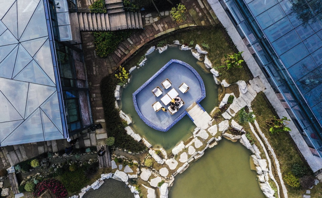 竹山镇猎神村矿咖民宿内,七彩石池与玻璃房交相辉映。熊伟 摄