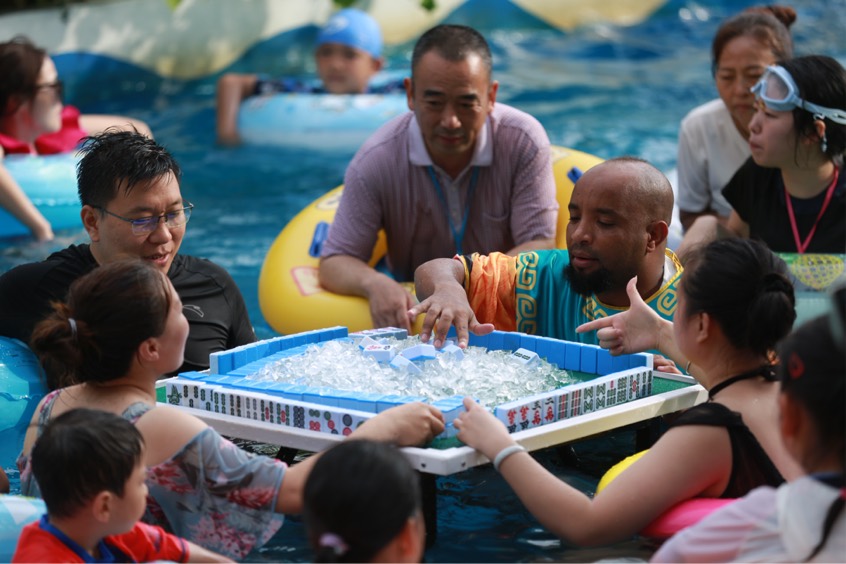 当日下午,美心水上乐园懒河区域的“水中冰麻将”成为焦点。两张特制的麻将桌漂浮在浅水区,桌面上铺满晶莹剔透的碎冰块。游客们泡在水中,双手在冰堆里摸索牌面,冰块与麻将碰撞发出清脆声响。