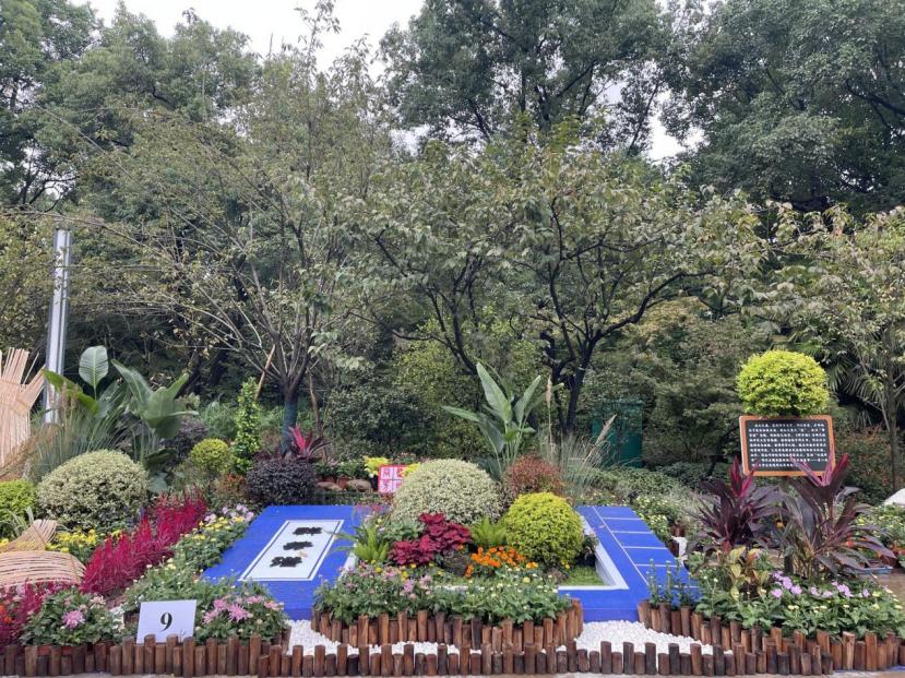 植物科普老师介绍,《群芳谱》本为明代植物学家王象晋编撰,系我国古代植物百科全书,堪称植物文化之瑰宝。花境作品以古籍封面作为画框,非常有新意。