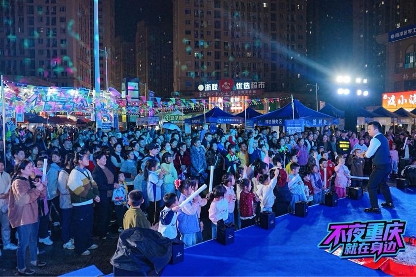 为进一步激活夜间消费,主办方还通过“渝职聘”“渝悦就业”平台提前发放3万元无门槛消费券,限活动当日现场使用。舞台上,主持人引导观众扫码领券、参与互动捕捉游戏,送出定制礼品,吸引众多居民驻足参与。现场还设有乐队表演、泡泡秀等环节,鼓励市民打卡分享,扩大活动影响力。